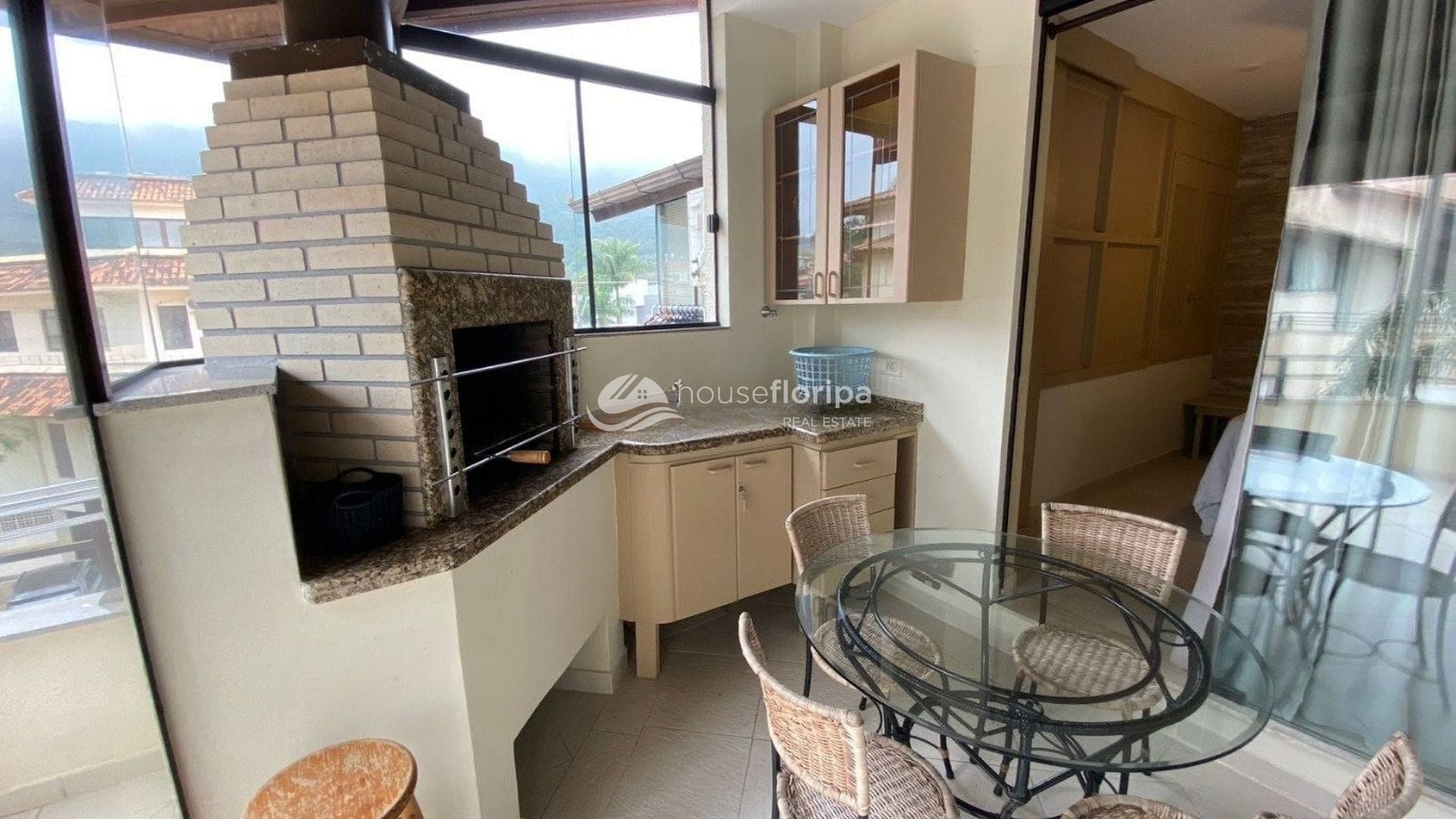 Terraço fechado com churrasqueira e área externa com linda vista panorâmica