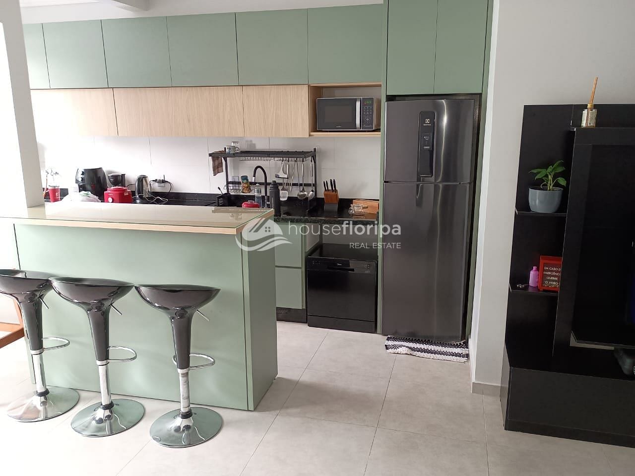 A cozinha possui móveis planejados de qualidade, com ótimo aproveitamento de espaço e integração com a área social.