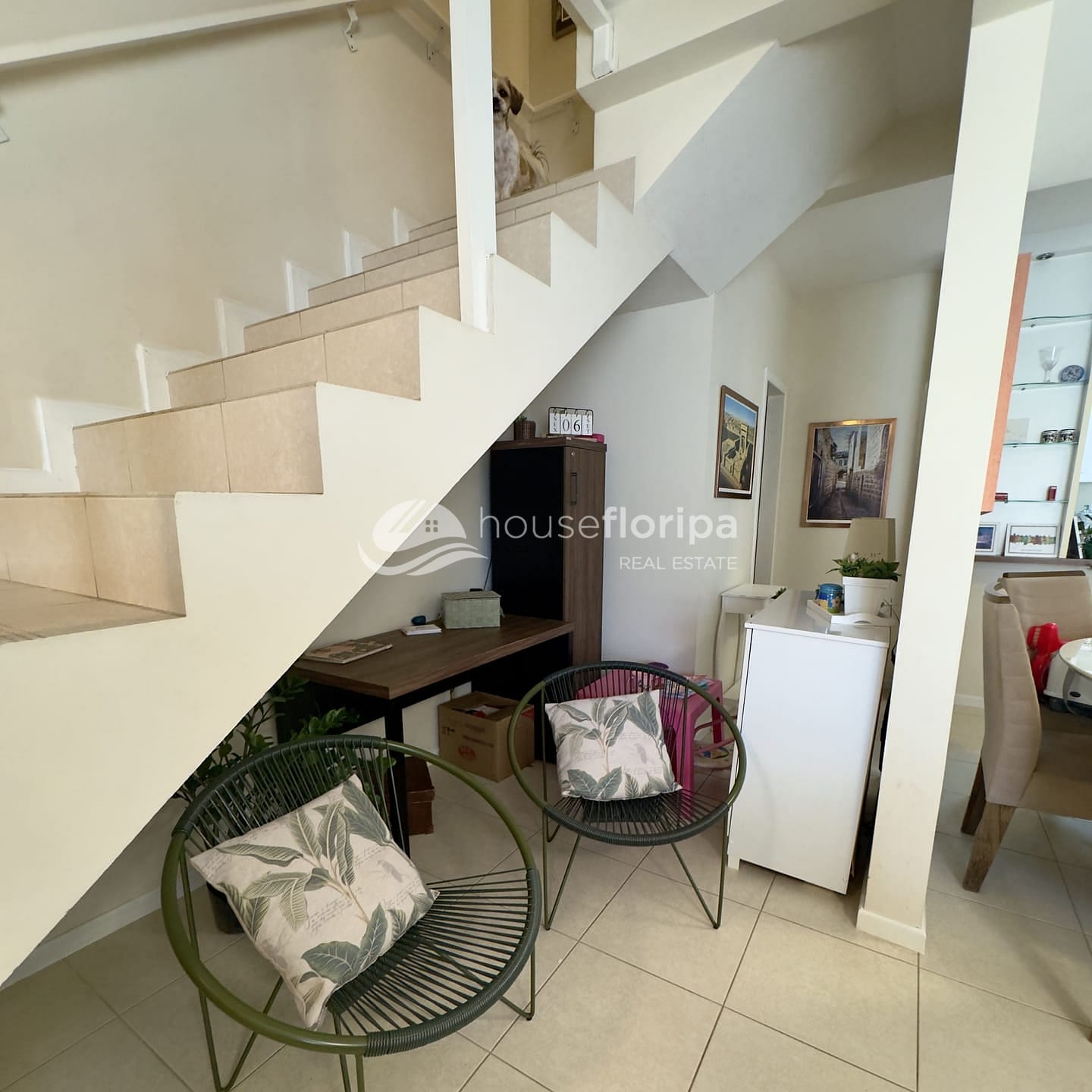 No térreo, conta com sala, cozinha com armários planejados, lavabo, lavanderia e área coberta com churrasqueira.