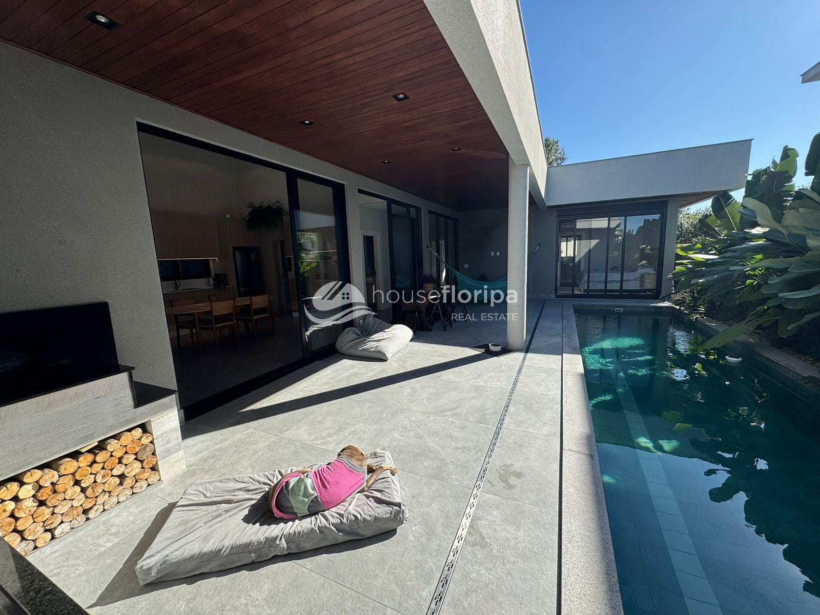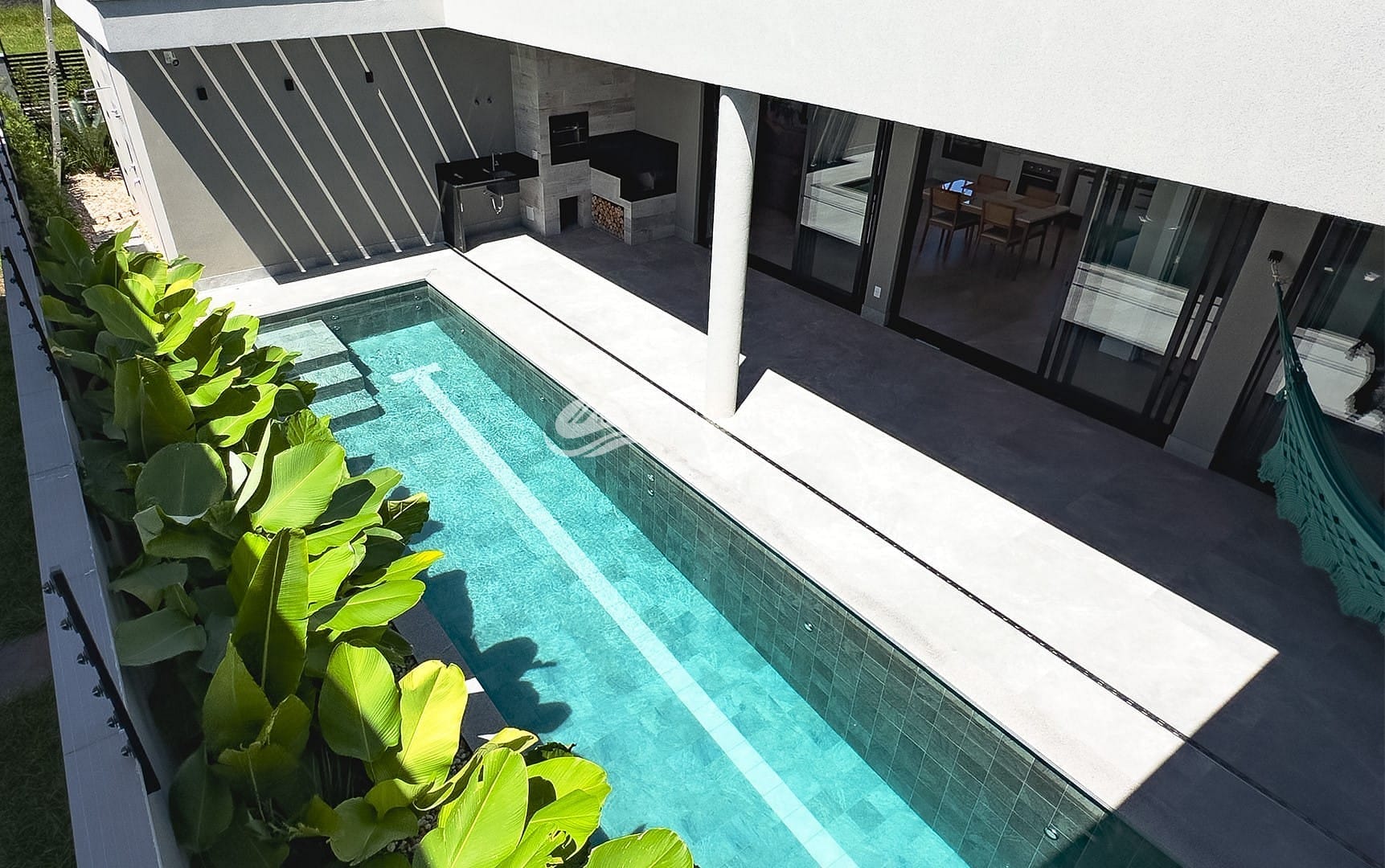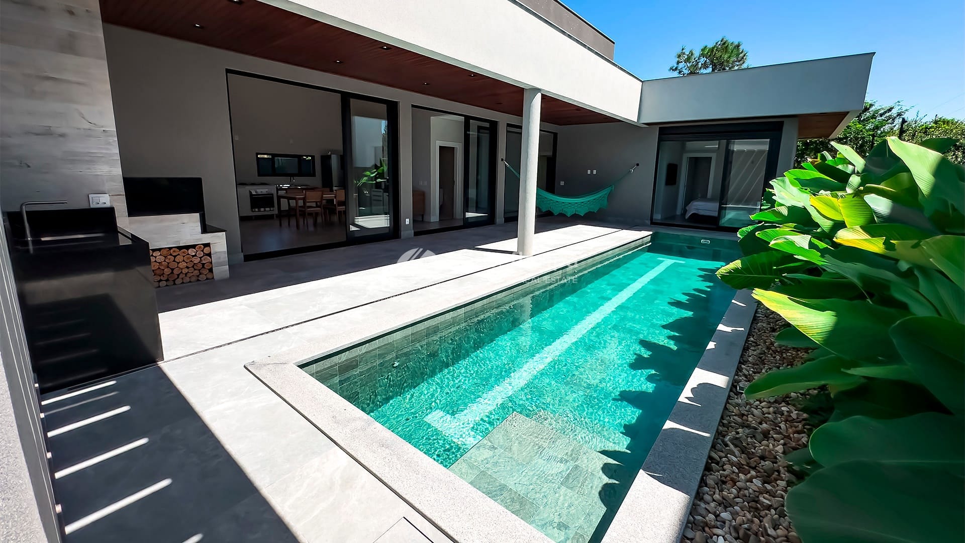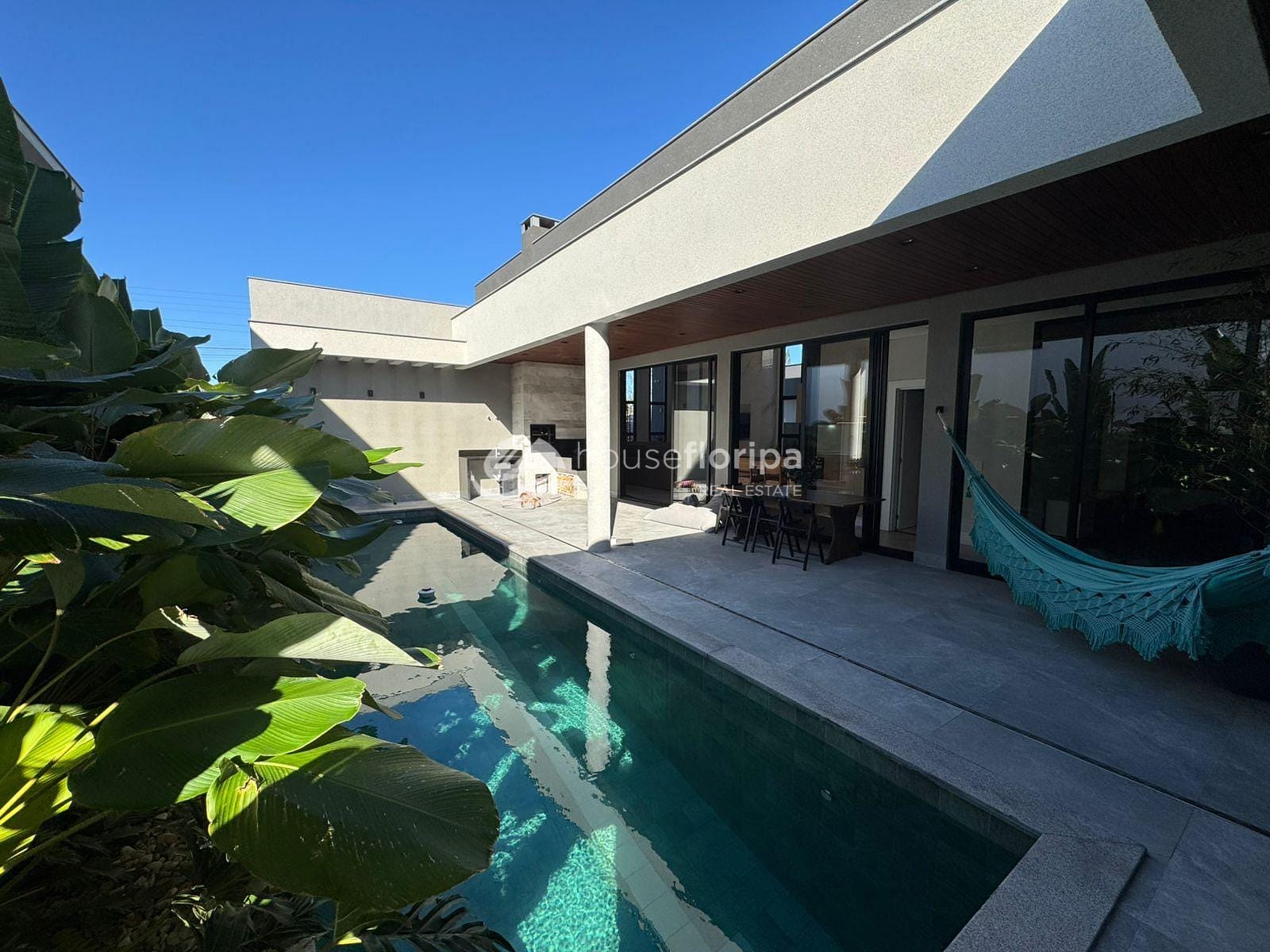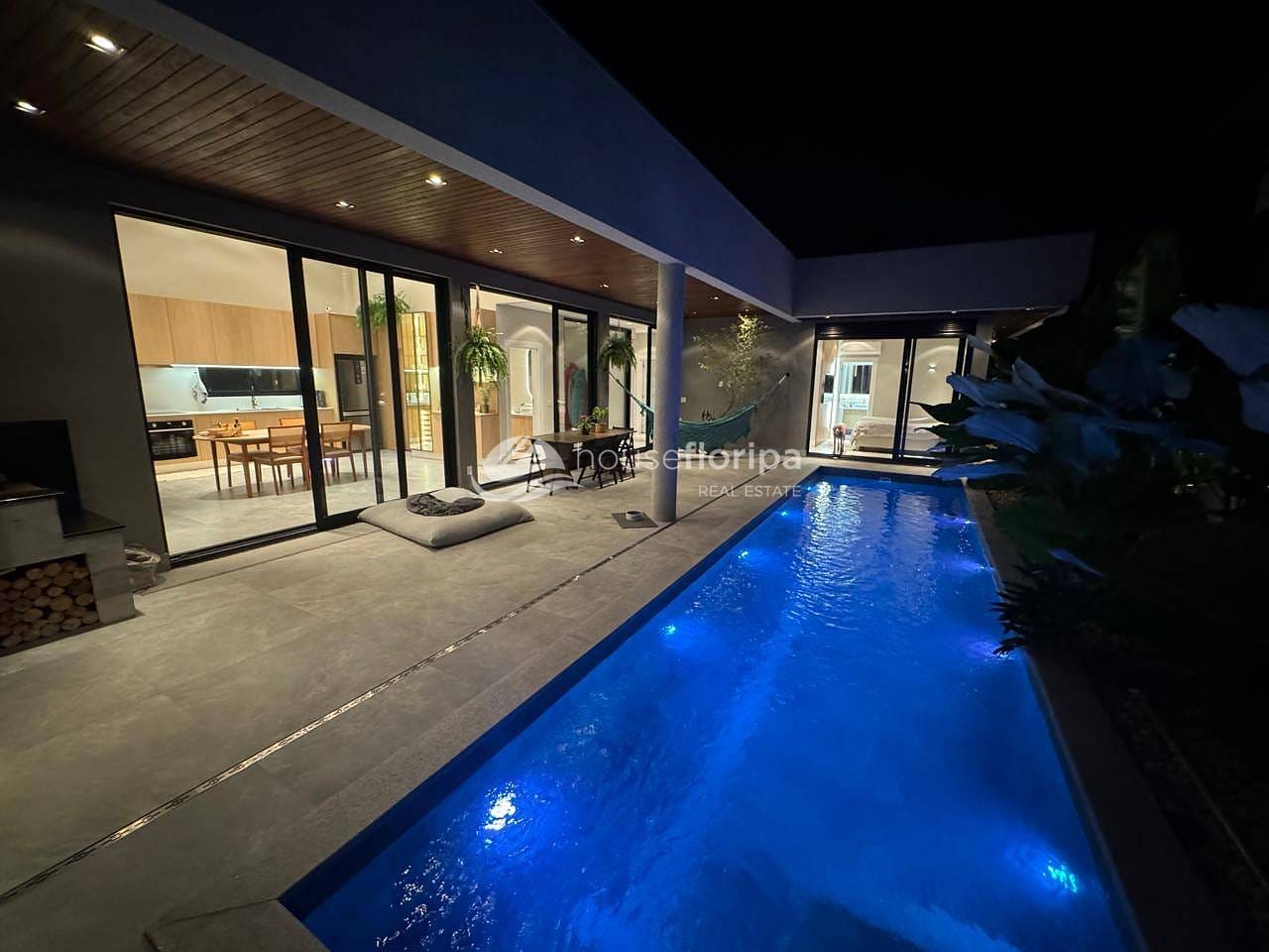 A área externa é igualmente convidativa, com uma área gourmet coberta, uma piscina generosa de 10m de comprimento por 2,5m de largura com espera para aquecimento e vaga coberta para dois carros. Além disso, a estrutura está preparada para um eventual segundo pavimento, espera para placas fotovoltaica.