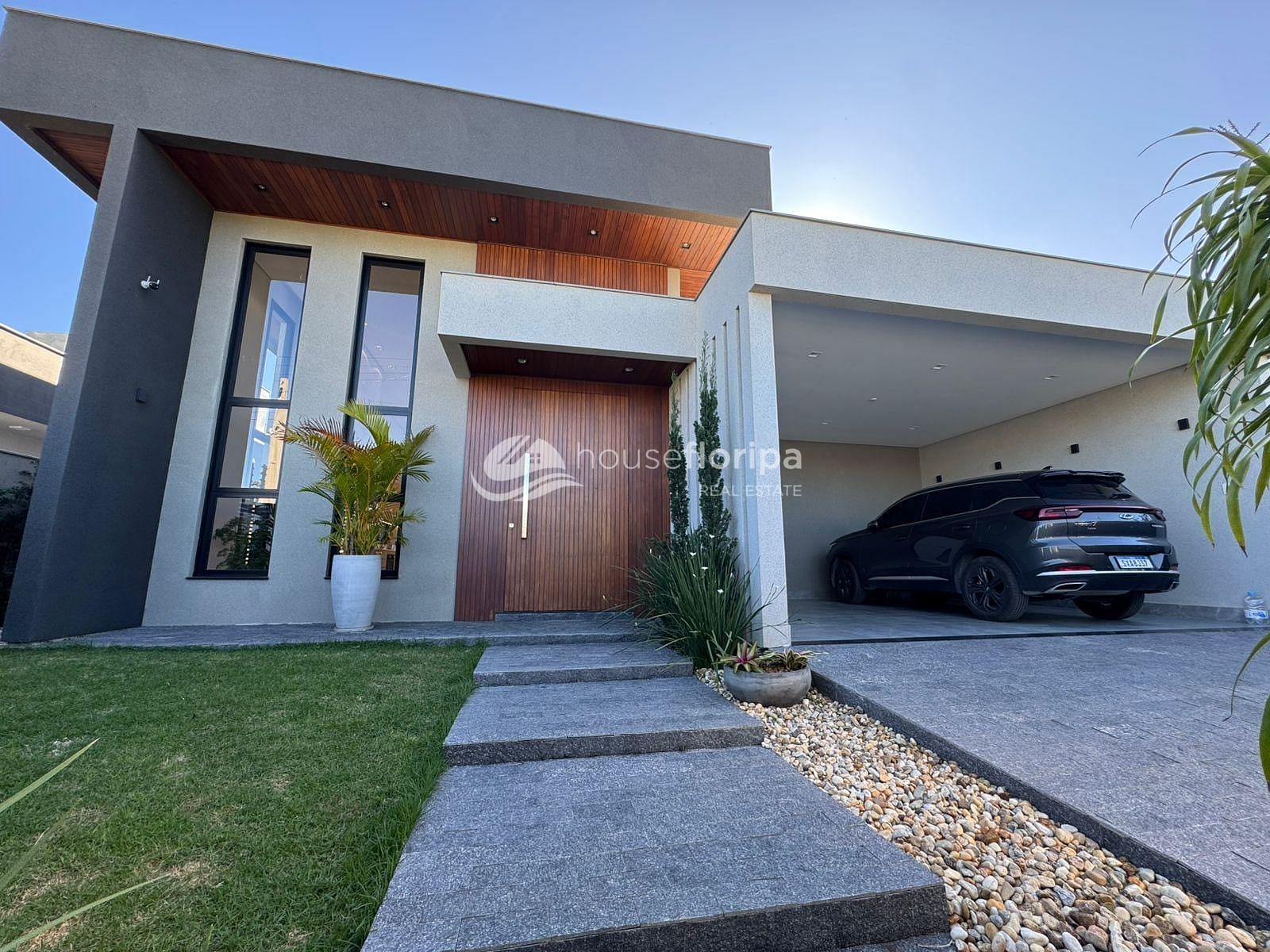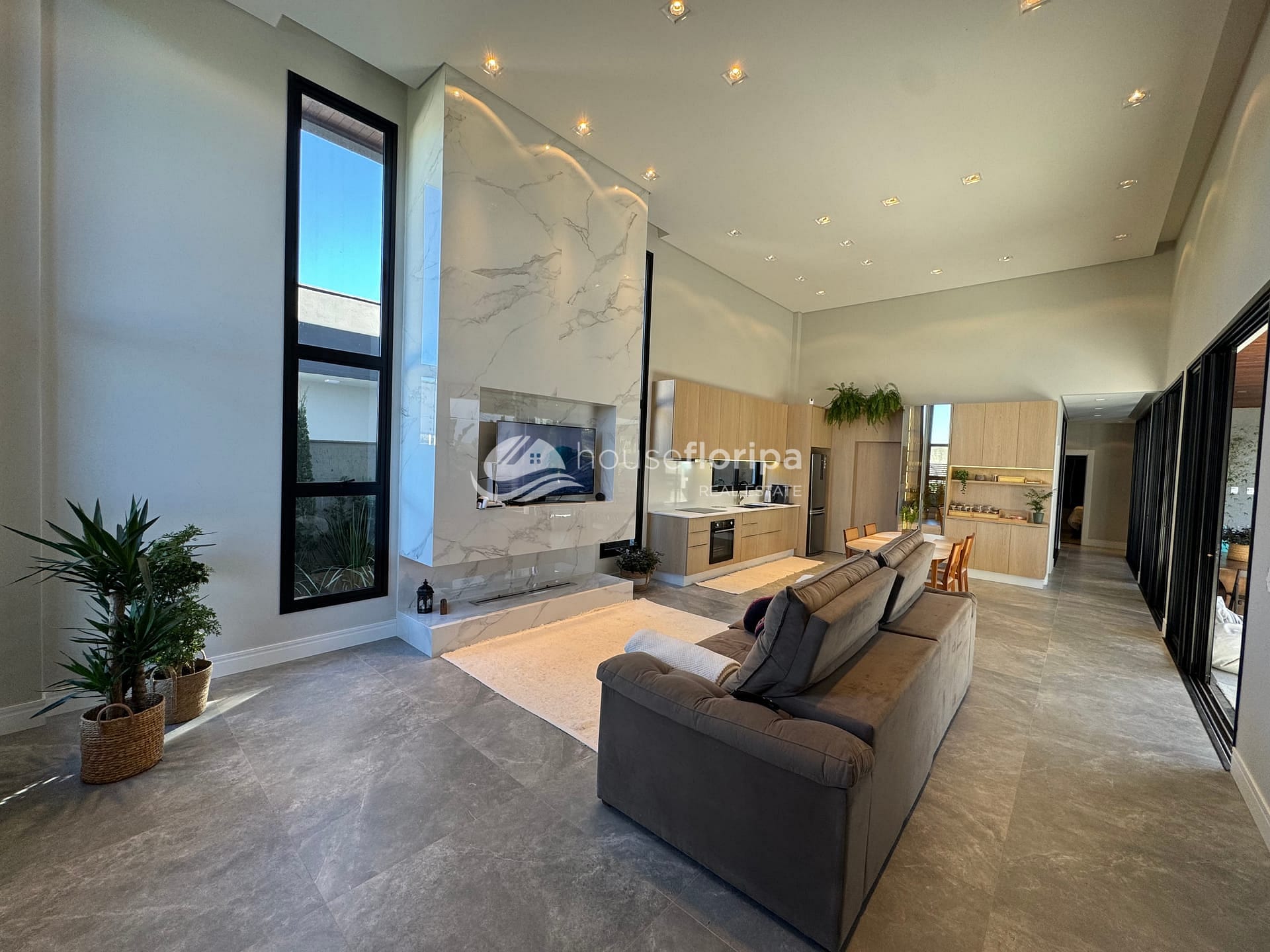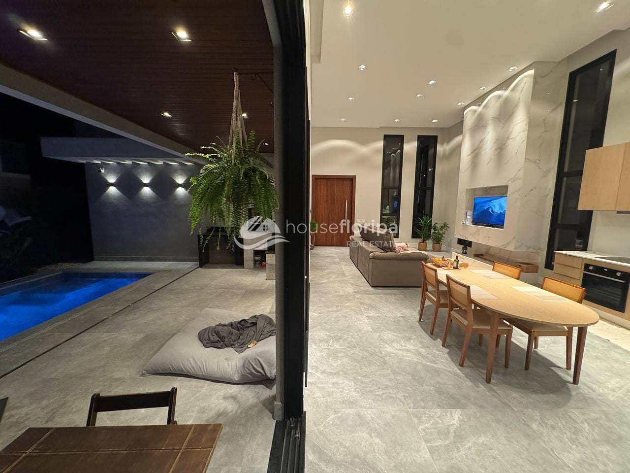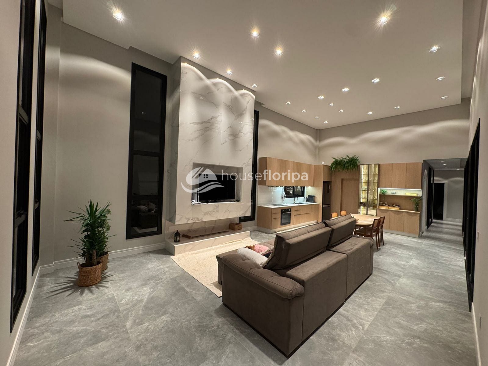 Com uma área construída de 258,78m² em um amplo terreno de 453,19m², esta residência oferece um ambiente espaçoso e moderno. Com três dormitórios, incluindo duas suítes - uma delas com closet -, além de um escritório e depósito, esta casa é ideal para aqueles que procuram por comodidade e espaço. A sala, integrada à cozinha, destaca-se pelo pé direito duplo de 5 metros e pela lareira ecológica, proporcionando um ambiente acolhedor.