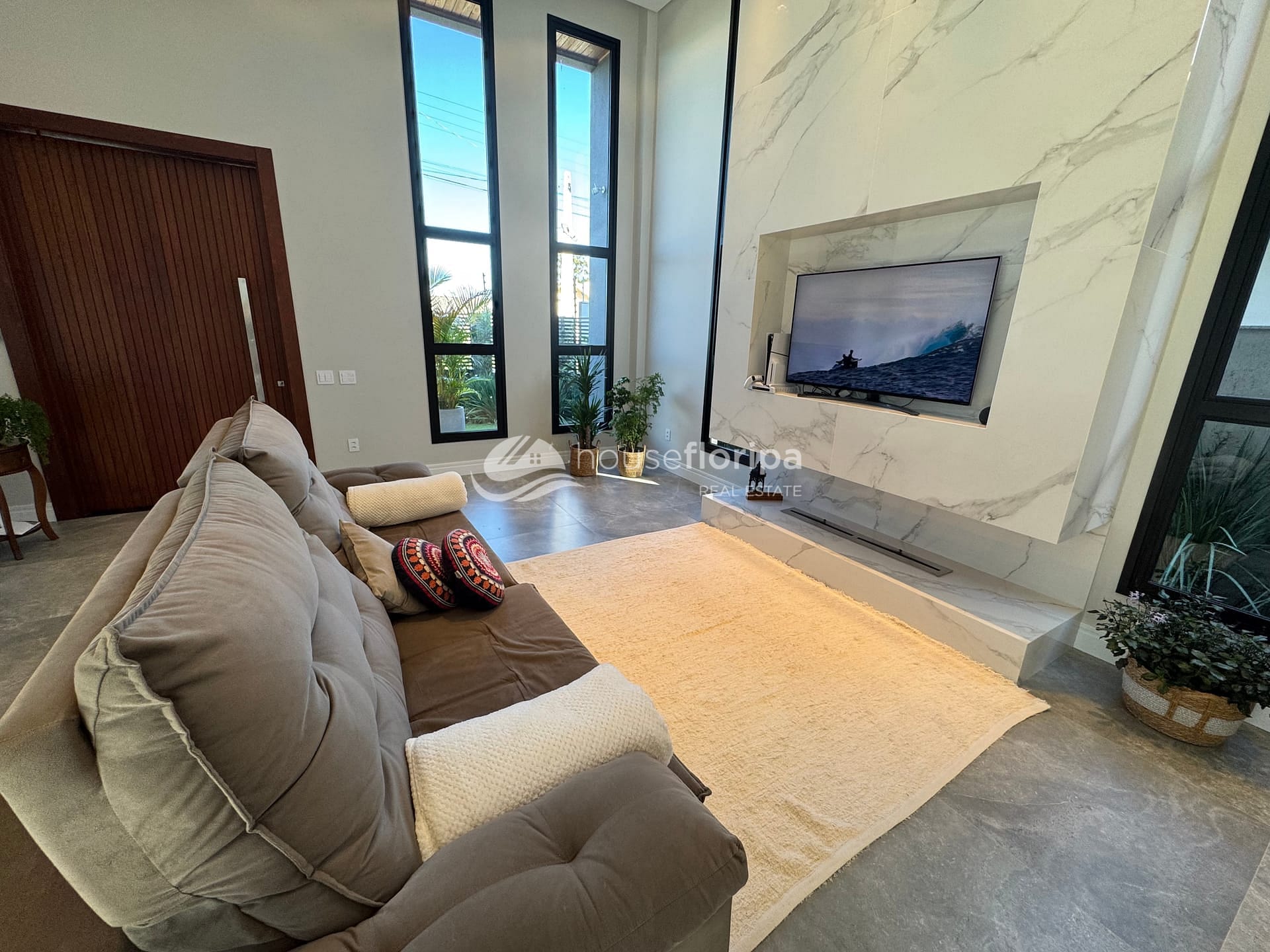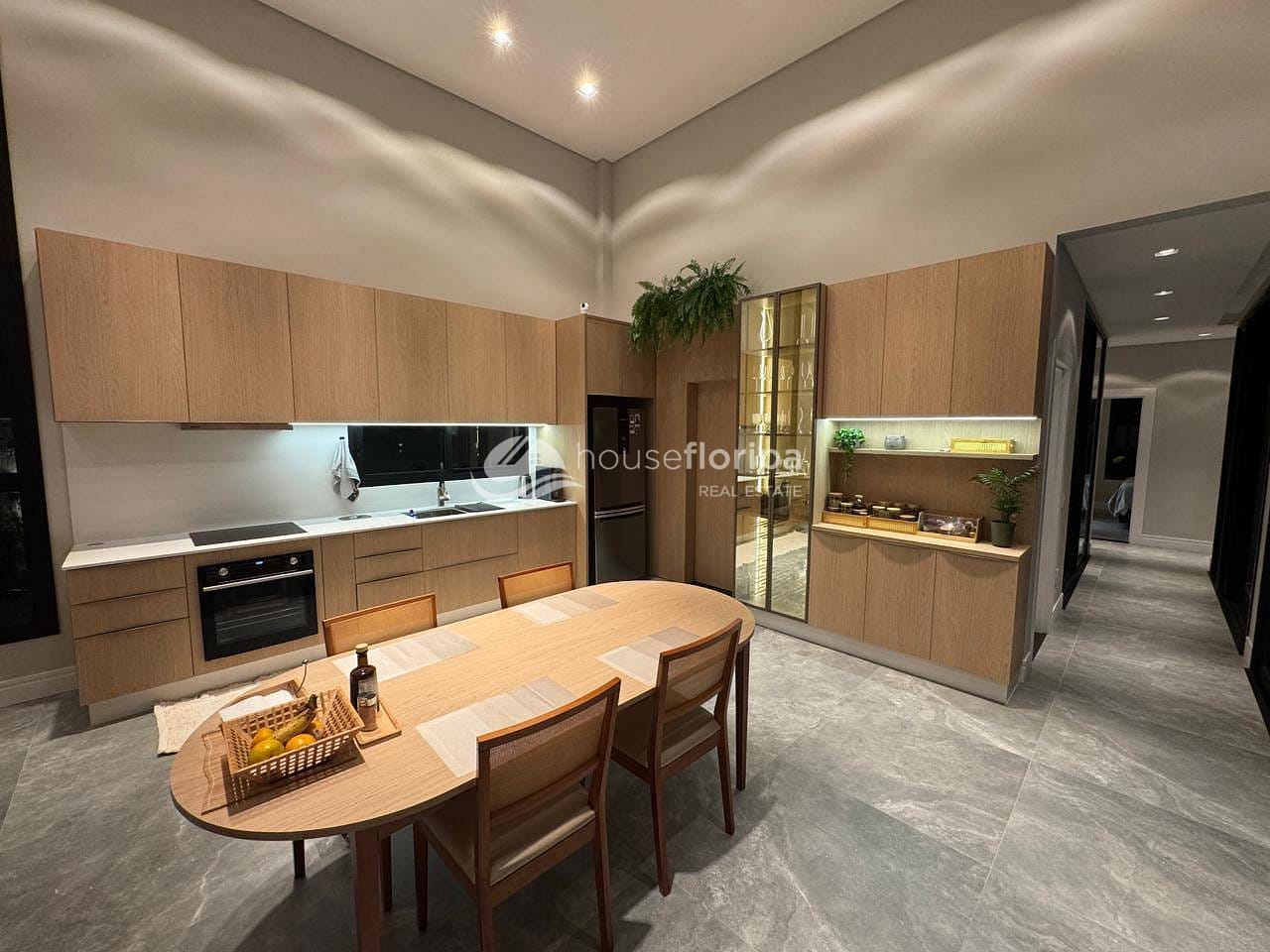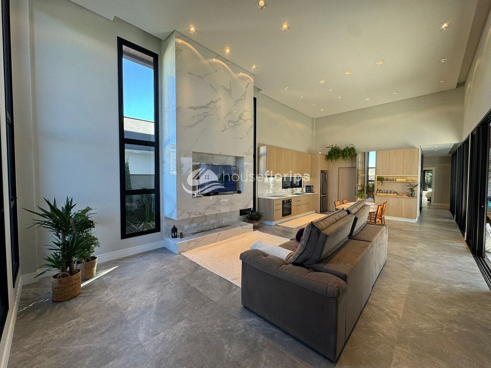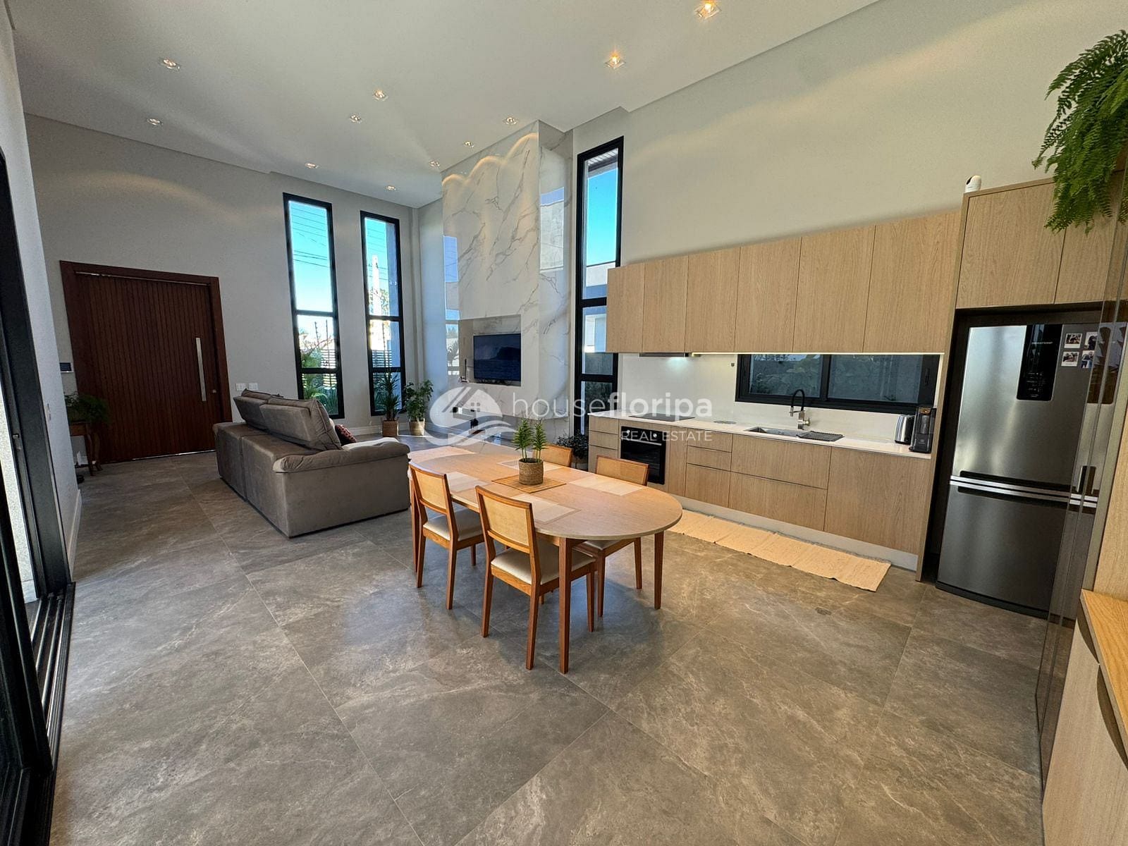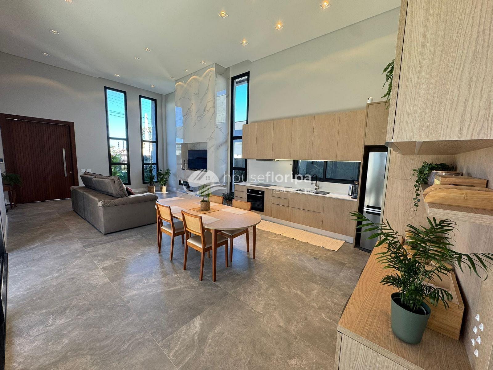 Com uma área construída de 258,78m² em um amplo terreno de 453,19m², esta residência oferece um ambiente espaçoso e moderno. Com três dormitórios, incluindo duas suítes - uma delas com closet -, além de um escritório e depósito, esta casa é ideal para aqueles que procuram por comodidade e espaço. A sala, integrada à cozinha, destaca-se pelo pé direito duplo de 5 metros e pela lareira ecológica, proporcionando um ambiente acolhedor.