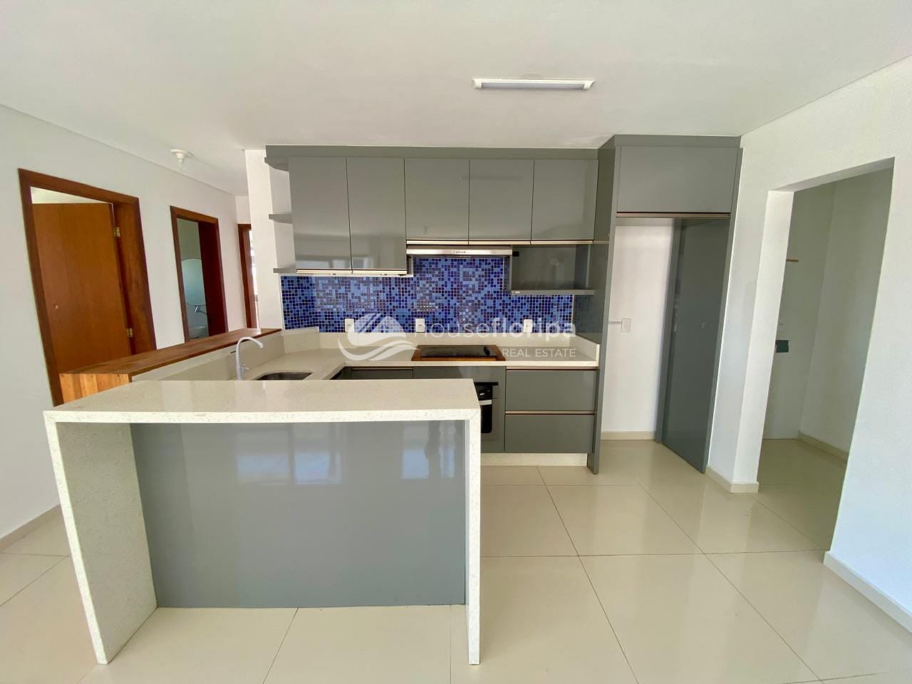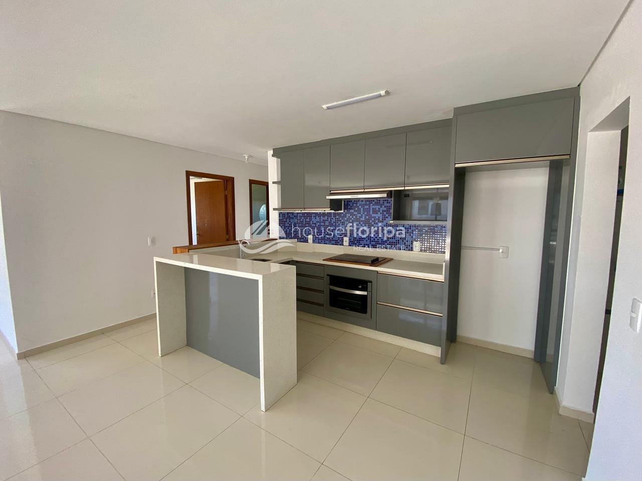 A cozinha planejada possui armários em laca, pia e fogão, garantindo funcionalidade no dia a dia. O imóvel dispõe ainda de uma área gourmet com churrasqueira, perfeita para receber amigos e familiares, integrada a um amplo terraço com deck, ideal para momentos de lazer e descanso.