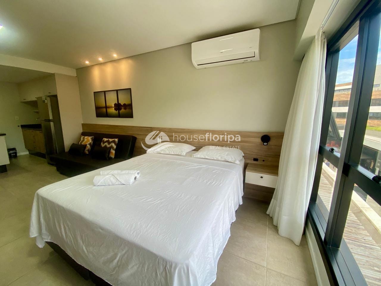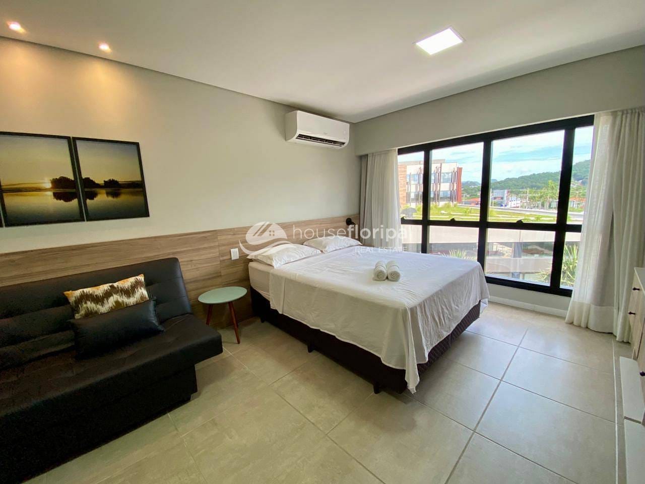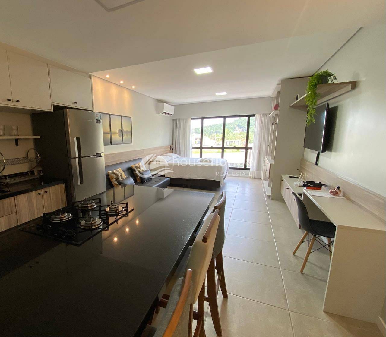 O studio conta com cozinha equipada integrada à sala de estar e banheiro moderno e funcional. O sistema de climatização garante eficiência e conforto térmico, enquanto a vaga de garagem privativa oferece comodidade. A posição estratégica no meio da torre proporciona vista para o pôr do sol e as montanhas do Ribeirão da Ilha, longe do ruído da rodovia.