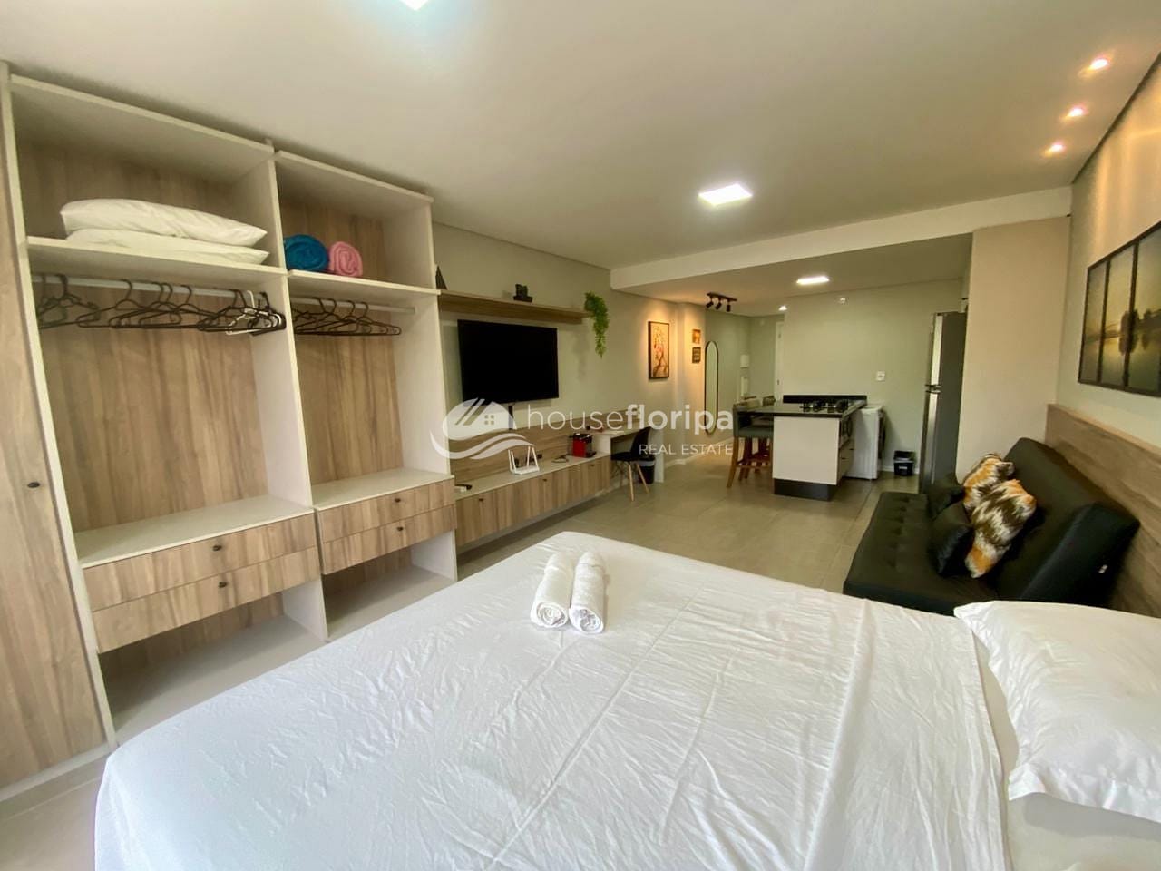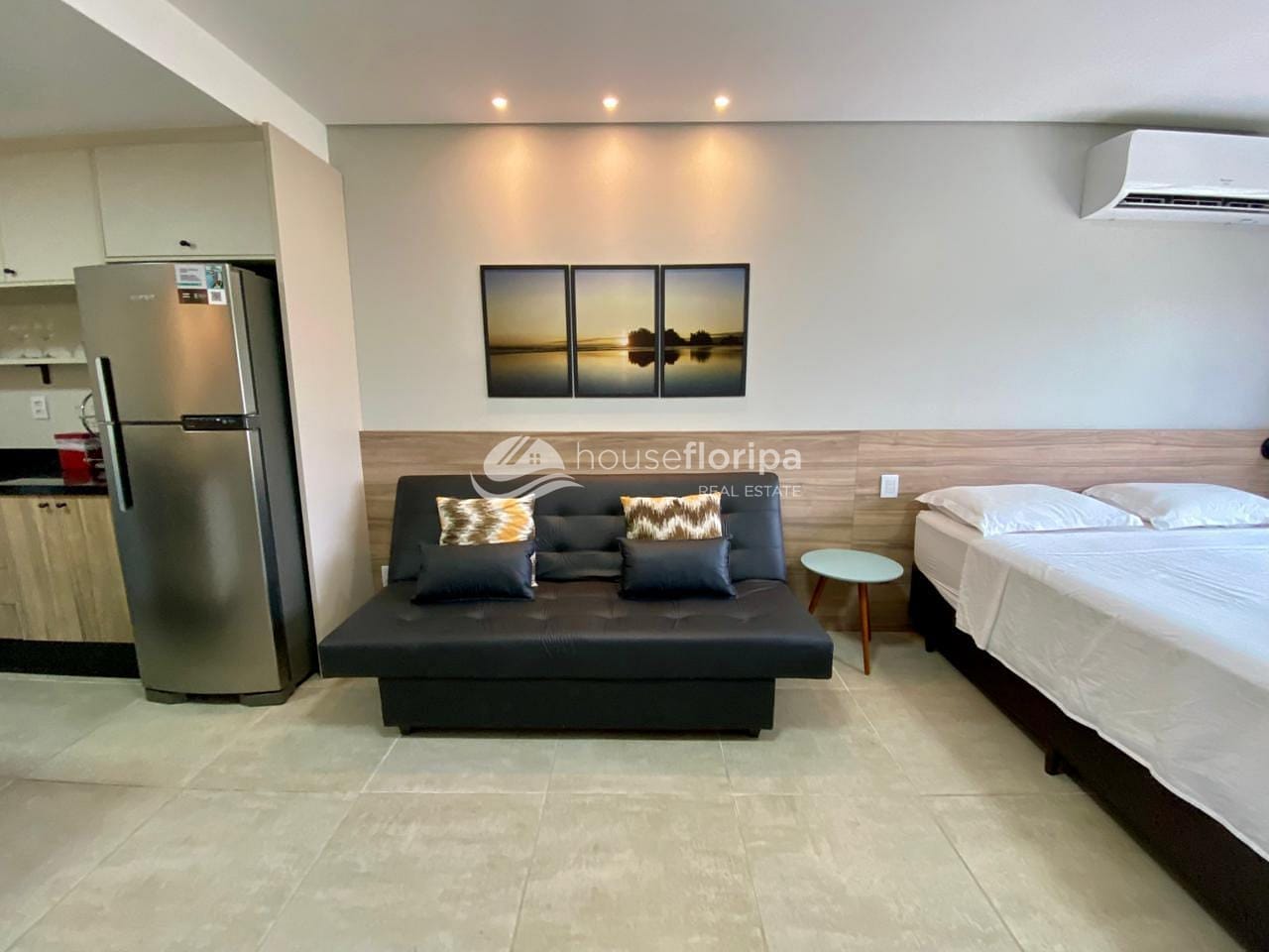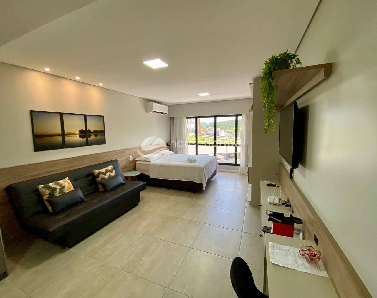 O studio conta com cozinha equipada integrada à sala de estar e banheiro moderno e funcional. O sistema de climatização garante eficiência e conforto térmico, enquanto a vaga de garagem privativa oferece comodidade. A posição estratégica no meio da torre proporciona vista para o pôr do sol e as montanhas do Ribeirão da Ilha, longe do ruído da rodovia.