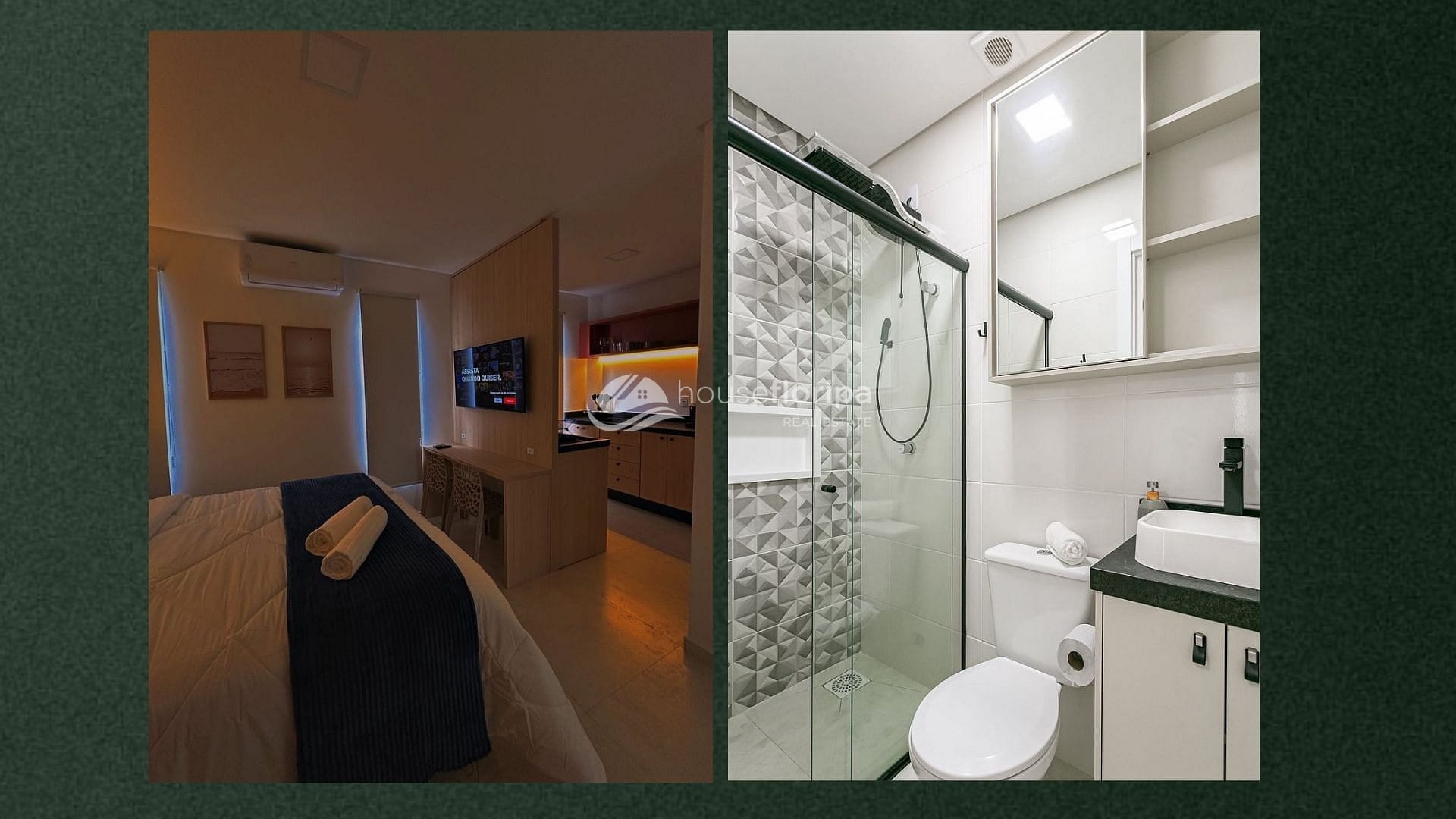 - Acomodações: Studio suíte com cama de casal (acomoda até 2 hóspedes)